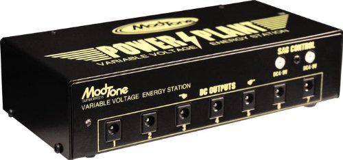 The ModTone Power Plant, is professional quality power supply for the discriminating player. This power supply is a heavy duty, multiple pedal power unit that rivals some of the biggest and best in the industry. The ModTone Power Plant features a toroidal transformer with isolated outputs. This unit shares many things in common with other power supplies, such as an IED power input, DIP switch power selection (9VDC to 12VDC), and two “SAG-able” outputs, but that is where the comparison ends. We have placed the DIP switches on the back of the unit, so if it is mounted on a pedal-board, it does not need to be removed to access the switches. The SAG adjustment pots are trim pot set screws, to lessen the chance of inadvertent changes. A courtesy outlet on the back has been rotated 90 degrees to accommodate wall wart style plugs. But here is the big difference; of the eight total outputs, five are regular 9VDC, two are 9VDC with SAG, and the final output is a 9VAC. That gives the user the ability to use this supply to power everything from a wah to...you name it, all with one unit.